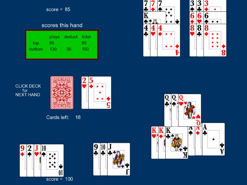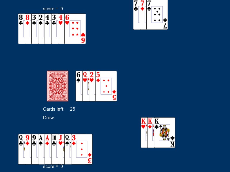 遊戲開始時,會以動畫方式將牌發到雙方手中。電腦的手牌是可見的,以便進行有效的程式測試。如果您正在玩,請儘量剋制住偷看對手手牌的衝動!
