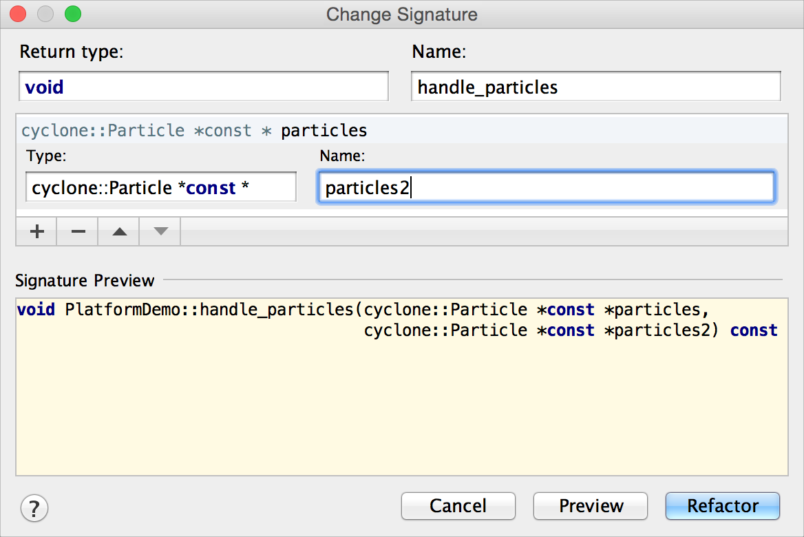 順便說一句,感謝程式碼補全,在這個對話方塊中輸入新引數型別非常容易。在我點選“重構”後,CLion 會更新簽名和所有用法,用給定的型別(在本例中為
