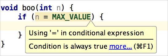 無處不在的 C/C++ 特有錯誤,例如條件中的“=”,也逃不過 CLion 的眼睛。