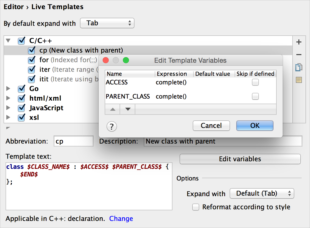 更進一步,CLion 允許你建立自定義的 Live Templates 或“Surround With”模板(它們可以快速用一個結構包圍選定的程式碼)。例如,這是一個快速獲取繼承自另一個現有類的類的快捷方式。