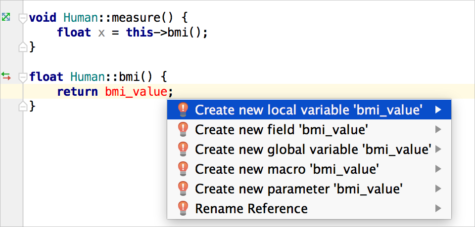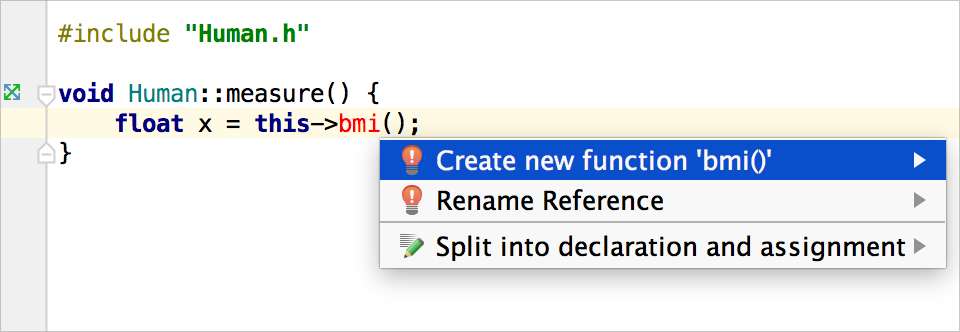 當我們在腦海中有了一個絕妙的想法時,我們不想花時間去做一些常規和瑣碎的事情。假設你使用了一個尚未實現甚至尚未宣告的函式。CLion 會將它標紅。你應該在這裡停下來實現這個函式嗎?一點也不!讓 CLion 生成一個存根,以後再回來處理。只需按下 Alt+Enter。