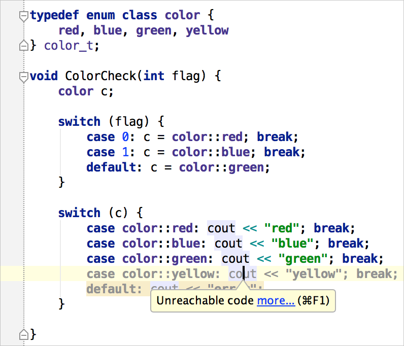 根據計算機的墨菲定律,每個非平凡的程式至少有一個 bug。但我們盡力修復我們所能修復的。為了定位和修復 bug,CLion 會持續監控你的程式碼是否存在潛在錯誤。任何可疑的程式碼片段都會在編輯器中高亮顯示,並會為你提供可能的快速修復選項來解決問題。要檢視它們,只需按下 Alt+Enter。IDE 還執行完整的資料流分析,為你檢測未使用的或無法訪問的程式碼。