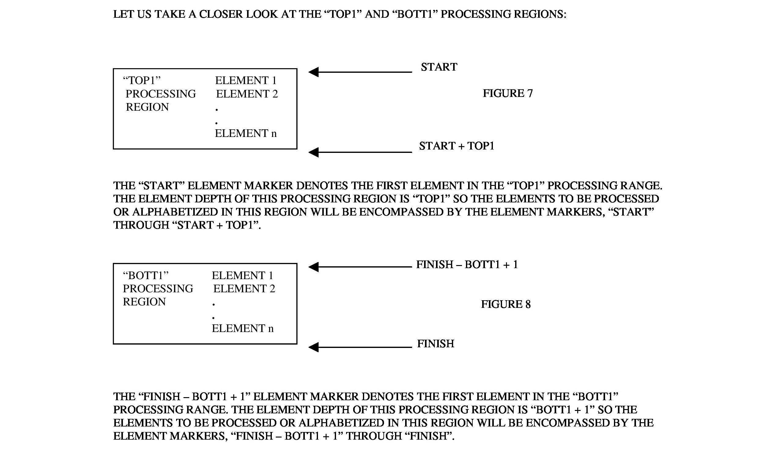 在這裡,我想談談“主”處理迴圈可能在資料寫回新排序資料檔案之前退出的方式。隨著處理在中途的遠記憶體資料結構“s”中接近尾聲,它不一定以偶數對的最終“top1”和“bott1”處理區域結束。它也可以透過“top1”或“bott1”處理區域之一將其“主”處理迴圈退出變數設定為嘗試退出“主”處理迴圈來接近完成。更具體地說,“top1”處理區域可以將其“主”迴圈退出變數“qqq”設定為 1,這意味著沒有更多的“top1”區域可以重新定義。“bott1”處理區域可以將其“主”迴圈退出變數“sss”設定為 0,這意味著還有一個“bott1”區域可以重新定義和排序。反之亦然。