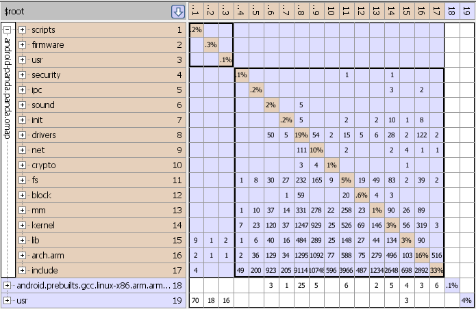 在應用了分割槽演算法之後,一些事情變得顯而易見。這個分割槽演算法根據依賴關係對子系統進行重新排序,揭示了哪些是“底層”,哪些是“高層”。在理想的實現中,高層的開發人員只需要理解底層的 API,而底層的開發人員只有在介面受到影響時才需要擔心高層。在一個耦合的系統中,開發人員需要同時理解兩個層次,這使得理解變更所帶來的影響變得相當困難。事實上,在 Android 核心中,幾乎所有的層次都是耦合的,開發人員有時可能需要理解數千個檔案才能對自己的更改有信心。