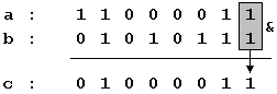 最右邊的位進行“與”運算的結果。同樣的操作也將在兩個變數的第二個位、第三個位之間進行,依此類推,直到對兩個變數的所有位都完成運算(每個位只與另一個變數的對應位運算)。